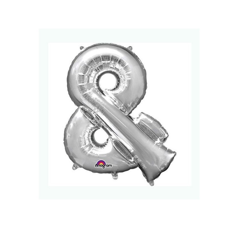 Globo letra & en color plata de 86 cm de altura,se puede hinchar con helio. Consumo de Helio: 0,0450m3 (helio no incluido en el precio) Tiempo de Flotacion con Helio: 3-4 Días Aproximadamente Valvula de autocierre: si Todos nuestros globos se venden s
